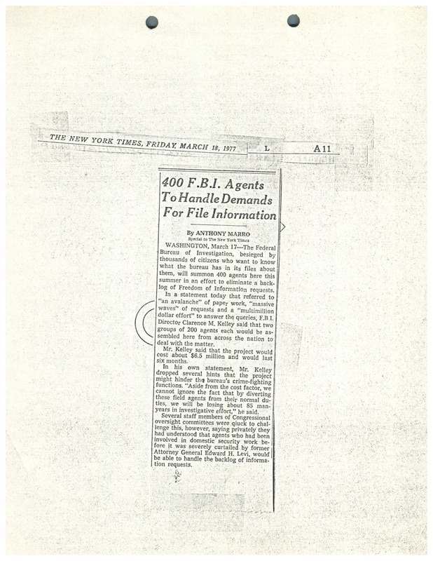 A newspaper article from The New York Times about the FBI assigning 400 agents to help eliminate a backlog of Freedom of Information requests. The agents will have a $6.5 million budget and it will take about 6 months to clear the thousands of requests that the FBI had received, causing the backlog of paperwork.