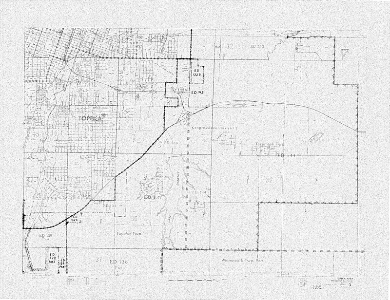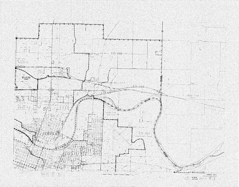 Case Data and Exhibits for Brown III, a relitigation of Brown v. Topeka Board of Education (1954) that corrected resegregation issues caused by open enrollment school choice in 1992. Topeka Area Metropolitan Map Series (Map Sheet L-25 2) with hand drawn markings by William Lamson marking school district boundaries.