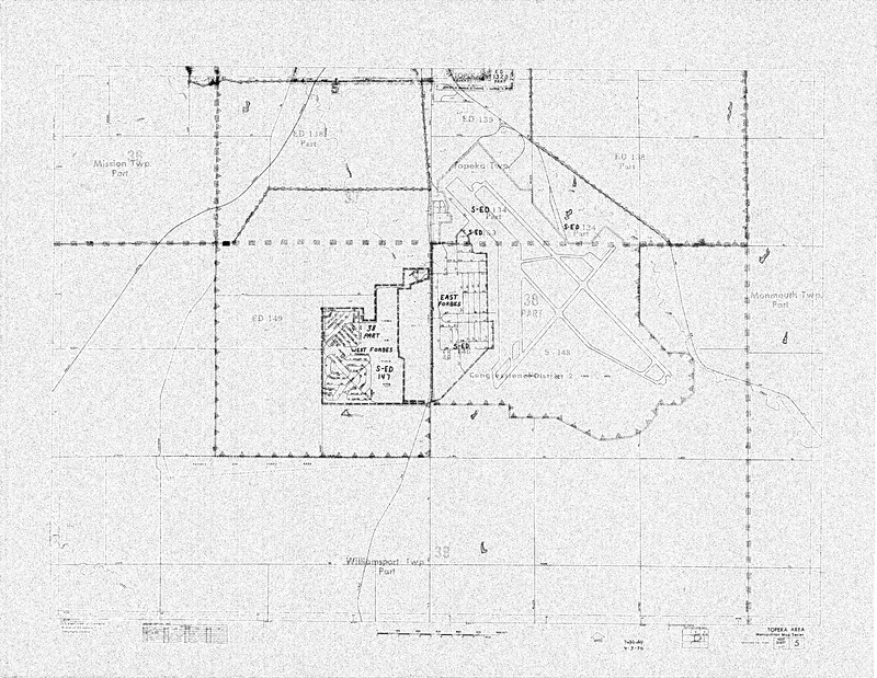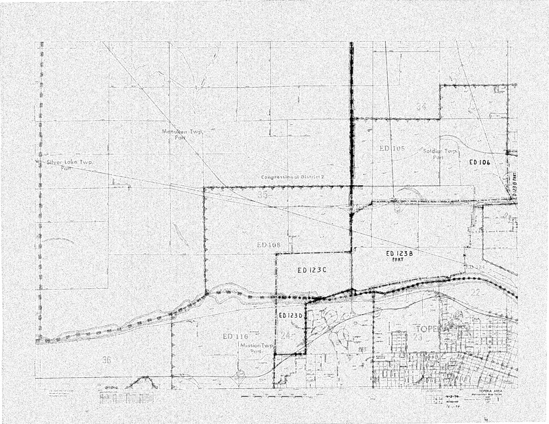 Case Data and Exhibits for Brown III, a relitigation of Brown v. Topeka Board of Education (1954) that corrected resegregation issues caused by open enrollment school choice in 1992. Topeka Area Metropolitan Map Series (Map Sheet L-27 5) with hand drawn markings by William Lamson marking school district boundaries.