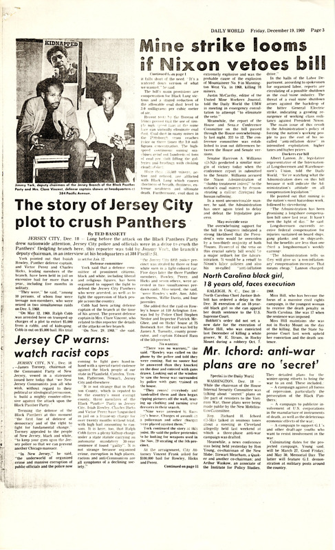 A newspaper article from Daily World, a newspaper in Jersey City, New Jersey. Jimmy York, the deputy chairman of the Jersey Branch of the Black Panther Party, talks to the writer about harassment the Black Panthers in the city face from the police, including bogus arrests with excessive bail and raids on homes and Party headquarters.