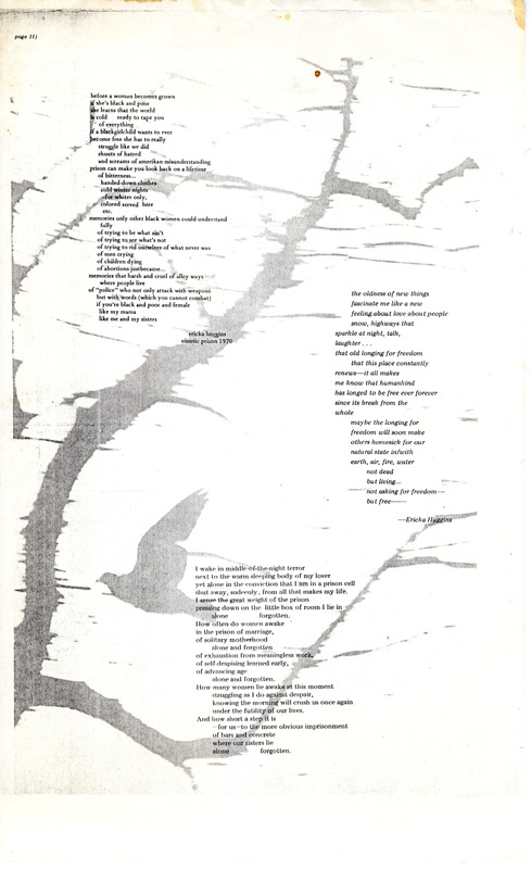 Three untitled poems written by Ericka Huggins. She signs first poem with her name and “Niantic Prison 1970” in reference to the York Correctional Institution in Connecticut. Each of the three poems makes reference to prison and themes of freedom and longing.