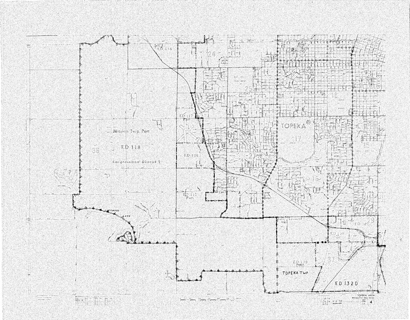 Case Data and Exhibits for Brown III, a relitigation of Brown v. Topeka Board of Education (1954) that corrected resegregation issues caused by open enrollment school choice in 1992. Topeka Area Metropolitan Map Series (Map Sheet L-26 4) with hand drawn markings by William Lamson marking school district boundaries.