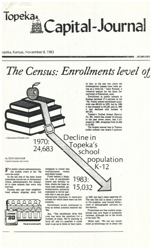 A newspaper article from the Topeka Capital-Journal about the decline in Topeka's K-12 public school population between 1970 and 1983. By 1983, those numbers had started to level out, but there were still recommendations to close 12 to 14 of the district’s 26 public elementary schools based on declining enrollment and building conditions.