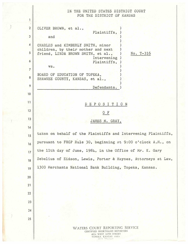 Case Data and Exhibits for Brown III, a relitigation of Brown v. Topeka Board of Education (1954) that corrected resegregation issues caused by open enrollment school choice in 1992. Transcript of Superintendent of Topeka Public Schools James M. Gray being deposed by ACLU attorney Chris Hansen.