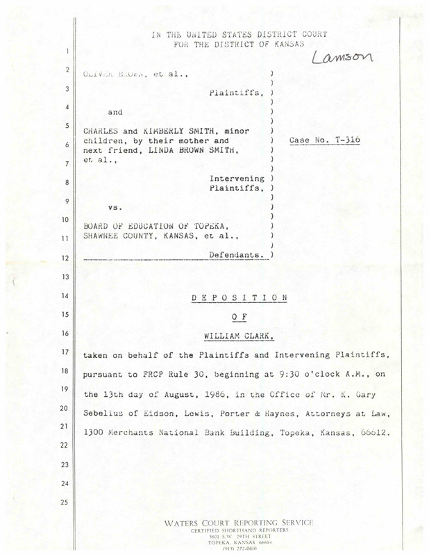 Case Data and Exhibits for Brown III, a relitigation of Brown v. Topeka Board of Education (1954) that corrected resegregation issues caused by open enrollment school choice in 1992. Transcript of Defense Witness William Clark being deposed by ACLU attorney Chris Hansen. Clark was acting as an expert demographic witness for the defense.