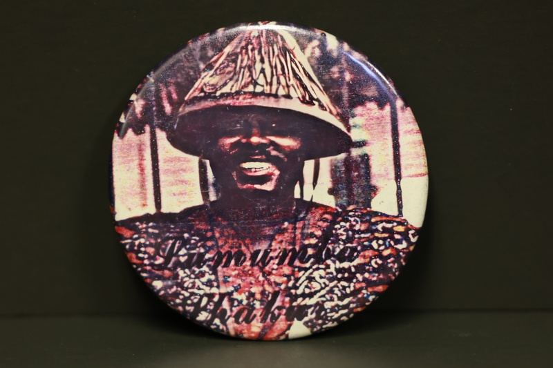 A multi-colored button with a photo of Lumumba Shakur. He was the first husband of Afeni Shakur and the two worked with the Black Panther Party in Harlem, New York, helping Black tenants organize rent strikes for adequate housing. In 1969, they were charged with conspiracy to bomb police buildings along with 19 others, known as the Panther 21.