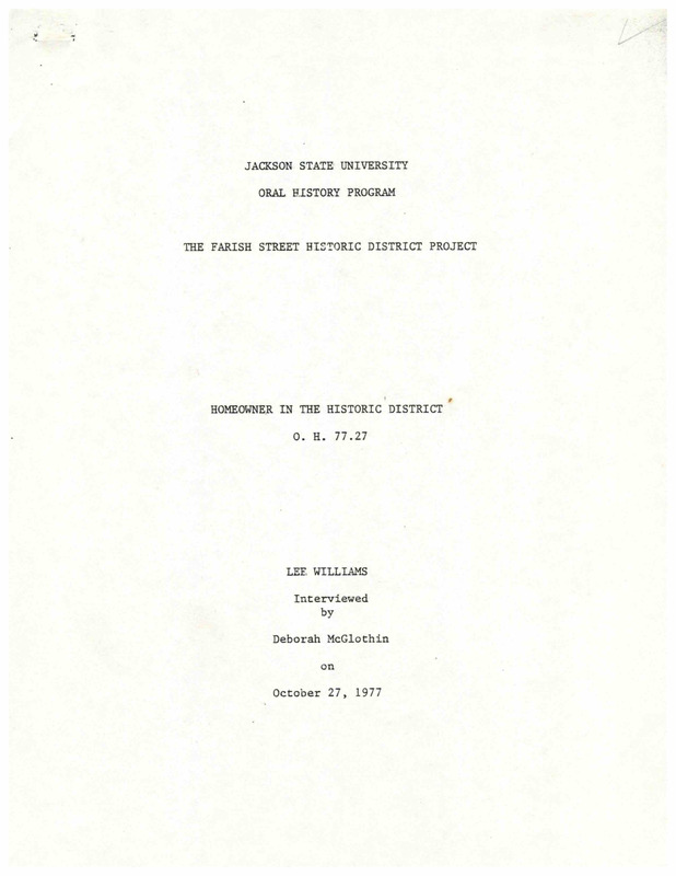 Lee Williams was born in 1900, moved to the Farish Street District in 1915, and lived on various streets for the rest of his life. He attended Smith Robertson School. In the interview, Mr. Williams recounts the different businesses, people, and schools over the years in the district. The transcript contains handwritten edits.