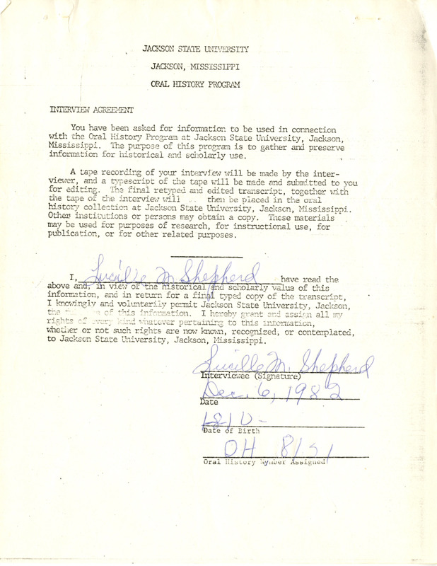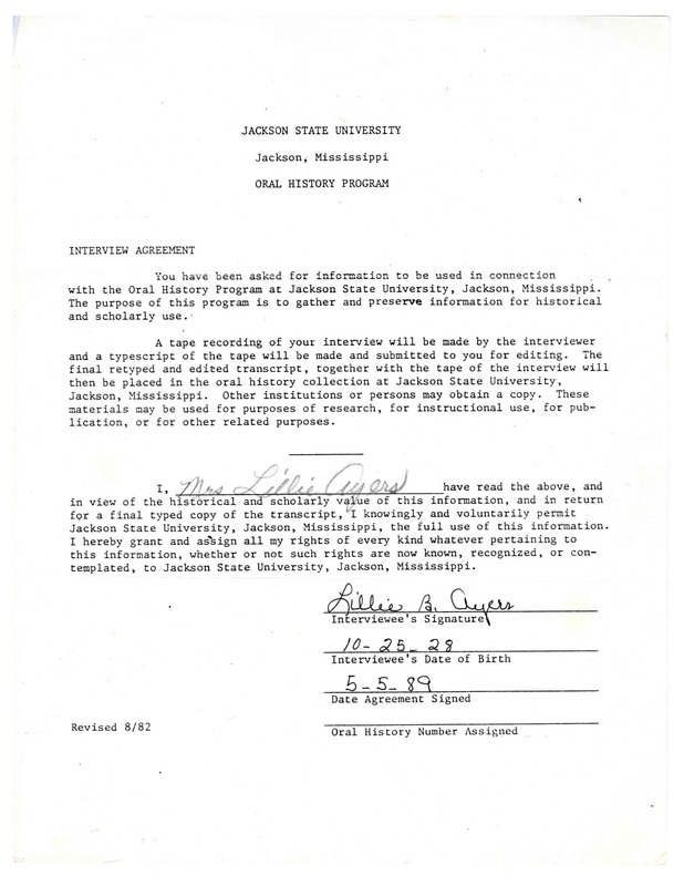 Lillie B. Jones worked at the Farish Street Young Women’s Christian Association (Y.W.C.A.) from the beginning and talks about her experiences there and what the YWCA meant to the community. She also talks about her childhood and young adult days and going through the Great Depression. The transcript is edited heavily with handwritten notes.