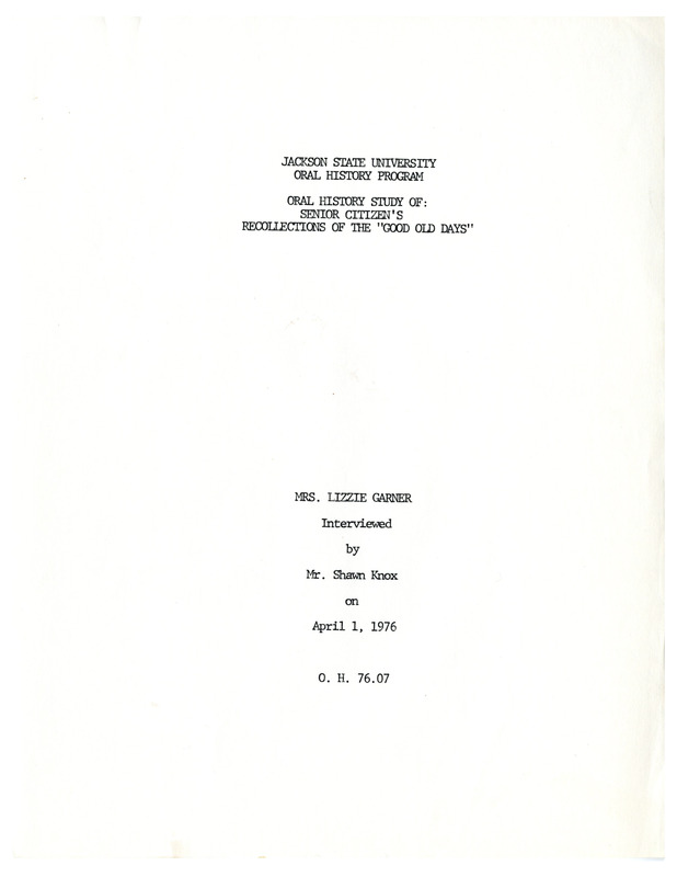 Lizzie Garner was born in 1903 and moved to Jackson, Mississippi, in 1940. She talks about her education, church life, and marriage and family. She recounts stories of experiences with segregation and talks about some of the changes in Jackson over the years. Her ideas about the "Good Old Days" of her childhood center around fun at school.