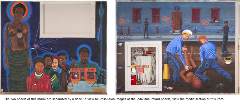 The right section reflects the tenet of “policing the police.” The officers’ stance is eerily similar to Derek Chauvin’s murder of George Floyd and the fire extinguisher underscores the scene’s violence. The left speaks to racialized beauty standards and “Black is Beautiful” messaging of the 1960s and 70s.