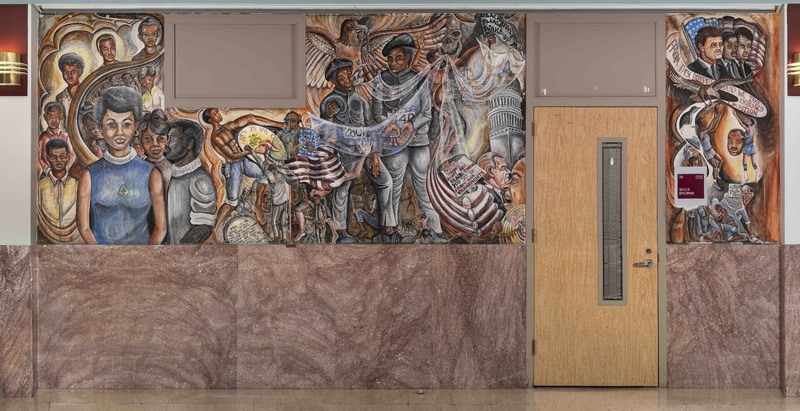 Ellison’s pair of murals speaks to political and social issues of the 1960s and 1970s. The murals express hope through resistance, in spite of the challenges facing Black America. In the middle, a bald eagle holds a broken lynch rope in its beak and “the law” in its talons.