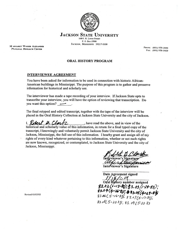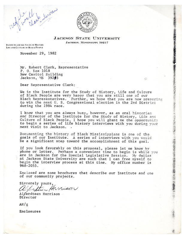 Collection of materials leading up to Robert Clark speaking on campus at Jackson State University for the 1983 Afro-American History Month Celebration. There are letters of invitation from Dr. Alferdteen Harrison as well as a biography of Robert Clark and the event program.