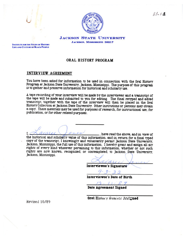 Lavaree Jones interviewed by Major O'Neal; both are students in Dr. Alferdteen Harrison’s Oral History class at Jackson State University. He asks her 3 questions about the origins of the Head Start program in Mississippi and the role Head Start plays in the Black community.