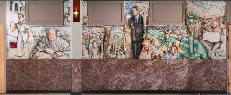 Royal’s mural illustrates the desegregation of public schools following Brown v. Board of Education (1954). In the center of the scene is attorney and future Supreme Court justice Thurgood Marshall, with Black students entering integrated schools. At the far left is Chief Justice Earl Warren.