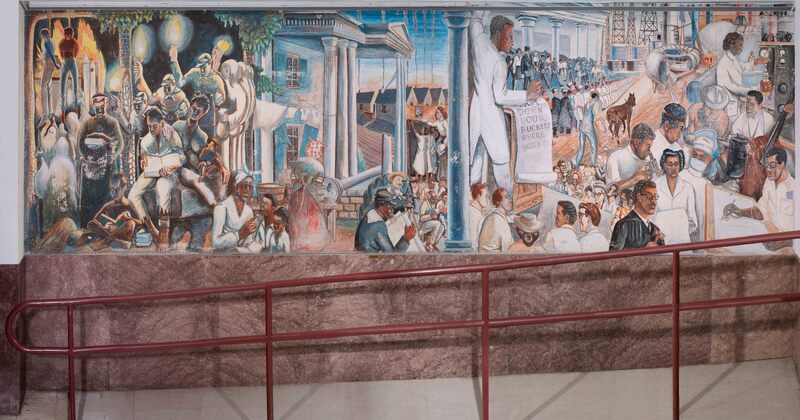 Washington’s mural is a timeline of Black education. On the left, he depicts slavery and lynching above enslaved people secretly reading. In the center, students write “Emancipation Proclamation” and Booker T. Washington delivers his "Atlanta Compromise" speech. The right depicts emerging Black professionals.