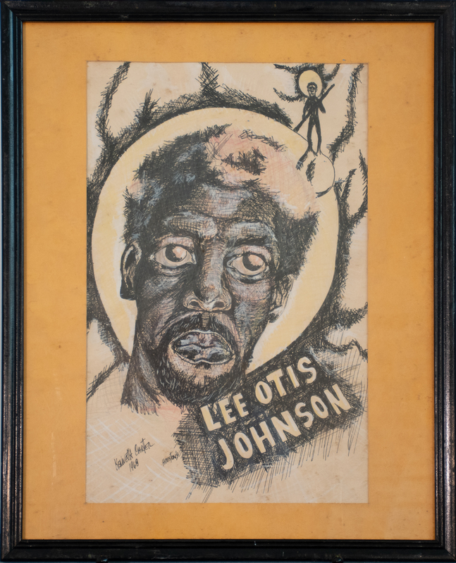 Carter’s drawing is of Lee Otis Johnson, a former TSU student, organizer, and leader of the Houston Student Non-Violent Coordinating Committee. Houston police repeatedly targeted Johnson, and in 1968 they arrested him for passing marijuana to an undercover officer, and a judge sentenced him to 30 years in prison. This injustice gained widespread notoriety, and “Free Lee Otis” became a rallying cry.
