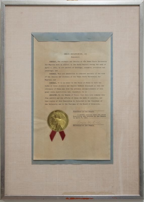 This Texas Senate resolution commends the art students and faculty of Texas State University for Negroes (now Texas Southern University) for their exhibition in the State Capitol in April 1951. It is notable that this exhibition took place years before desegregation.