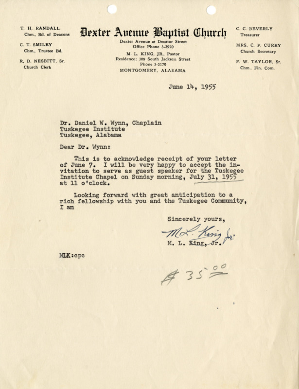 A letter from Dr. Martin Luther King Jr. to Chaplain Wynn stating that he would not be able to attend Religious Emphasis Week from Jan 6-10, 1958 due to an overseas trip to India and completing his book.