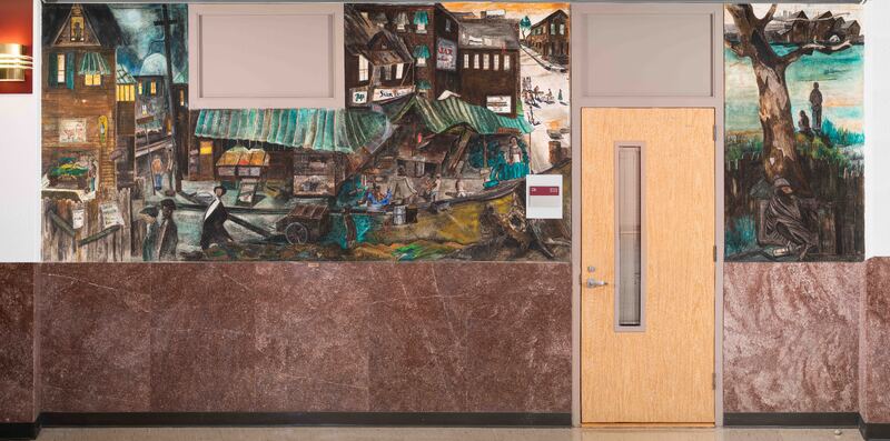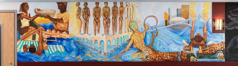 A native of New Orleans, Green transferred to TSU’s art program following Hurricane Katrina. His mural ties different aspects of New Orleans history and culture together through floodwaters. Enslaved ancestors stand at auction, and the city skyline, including the Superdome, is featured prominently.