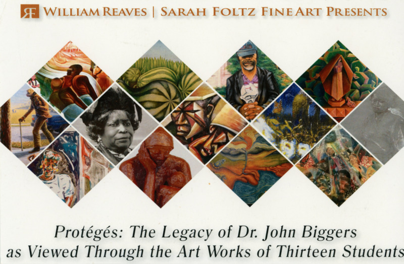 This is an invitation from William Reaves - Sarah Foltz Fine Art gallery to the exhibition Protégés: The Legacy of John Biggers As Viewed Through the Artworks of Thirteen Students. The featured artists - Charles Criner, Geraldine Crossland, Karl E. Hall, Earlie Hudnall, Jr., Harvey Johnson, Earl S. Jones, Josie Mendoza Postel, Robert Meyers, Elizabeth Montgomery Shelton, Kermit Oliver, Jesse Sifuentes, Charles Thomas, and Roy Vinson Thomas - are all Texas Southern alumni and students of Dr. Biggers.