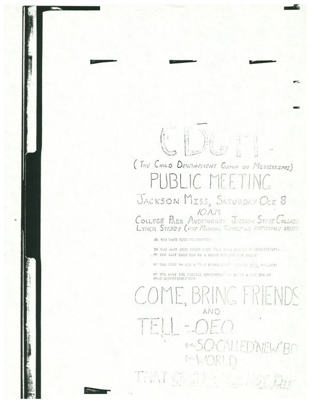 This flier announces a Child Development Group of Mississippi (CDGM) public meeting at the College Park Auditorium at Jackson State College on Saturday Oct. 8, 1966, at 10am. The purpose of the meeting was to bring the community together to discuss ways to save CDGM from being overtaken by the state and federal governments.