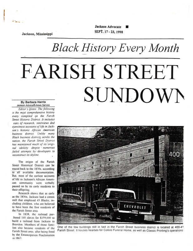 A newspaper article from the Jackson Advocate about the history of the Farish Street Historic District. Some research for the article comes from Jackson State's Farish Street Oral History Collection.