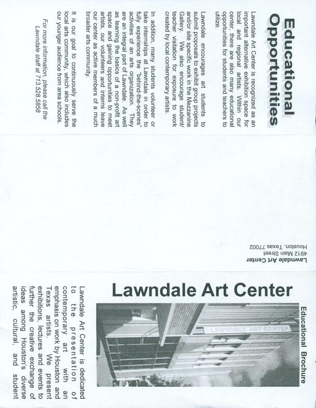 This is a brochure from Lawndale Art Center advertising, among other things, the Otabenga Jones & Associates’ exhibition Symmetrical Patterns of Def. Made up of members Dawolu Jabari Anderson, Jamal Cyrus, Kenya Evans and Robert A. Pruitt, the collective was formed to harness the group's creativity and provide them an entry-point into the art world. The four met and became friends in Harvey Johnson’s drawing class at Texas Southern University.