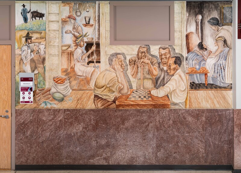 Ross’s mural represents Black rural life in the early to mid twentieth century. The composition highlights the gendered division of labor, and how women’s work focuses on maintaining the home. Ross grew up in Huntsville, Texas, and this scene may represent his background and experiences.