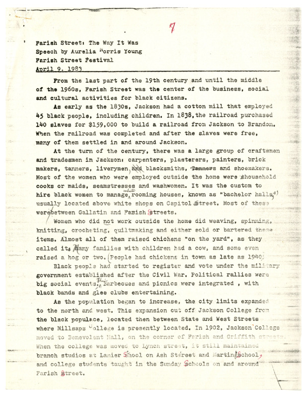 Aurelia Norris Young was a prominent Civil Rights activist and professor of music at Jackson State College and Tougaloo College. She gave this speech on the history of the Farish Street Historic District on April 9, 1983, at the Smith Robertson Neighborhood Folklife Festival, which honored the history and legacy of the district.