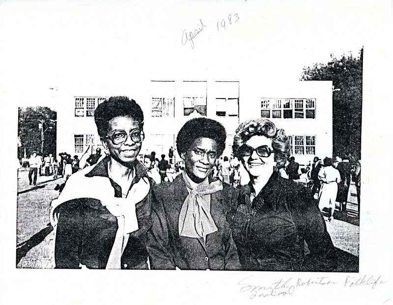 A copy of a photograph of an unknown woman, Dr. Alferdteen Harrison, and Dr. Cora Norman at the Smith Robertson Neighborhood Folklife Festival, April 9-11, 1983. The festival was a one-time grant sponsored event held on the grounds of the Smith Robertson Museum to celebrate the rich history and culture of the Farish Street Historic District.