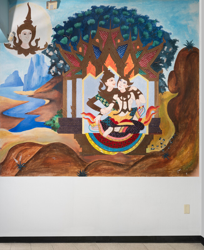 Charoennimuang’s Hannah Hall mural draws inspiration from her birth country, Thailand. In her own words, it “is a Thai style mural-painting that expresses the love of two human beings…surrounded by the beauty of nature…. The man and woman are dressed up in Thai-style like the old days…neatly weaved and knitted in a Thai pattern…made of Thai silk.” The study for this mural included a dragon in the upper right corner that was cut from the final design.