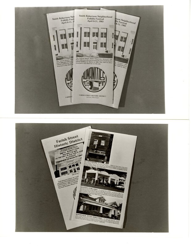 Two photographs of brochures for the Smith Robertson Neighborhood Folklife Festival, April 9-11, 1983. The festival was a one-time grant sponsored event held on the grounds of the Smith Robertson Museum to celebrate the rich history and culture of the Farish Street Historic District.
