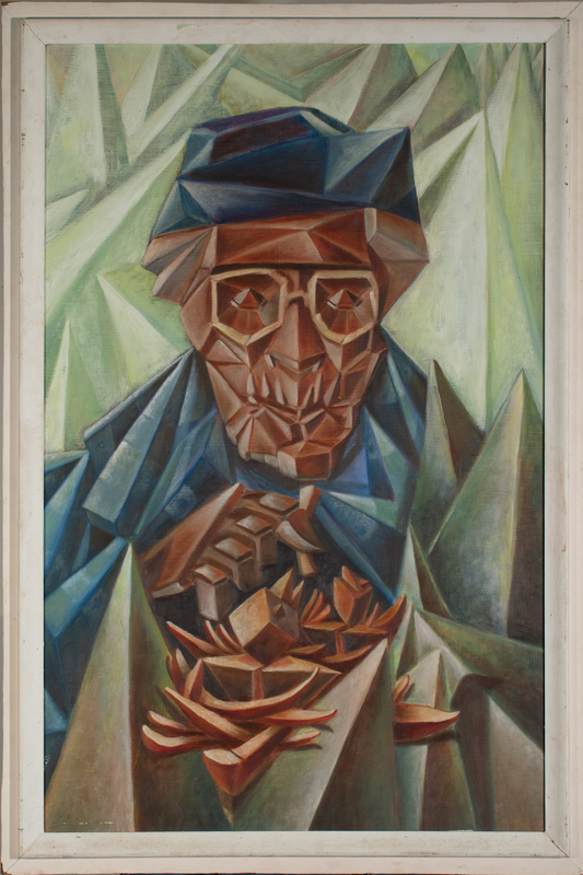 Donato’s painting portrays an elderly woman feeding hungry birds. This particular geometric style of painting is characteristic of students of Dr. Biggers who attended Texas Southern in the mid-to-late 1970s. The mother-child relationship is a common motif in the artwork of TSU students, usually a human mother and child or an animal mother and child. This painting seems to be unique in its depiction of a cross-species maternal relationship.
