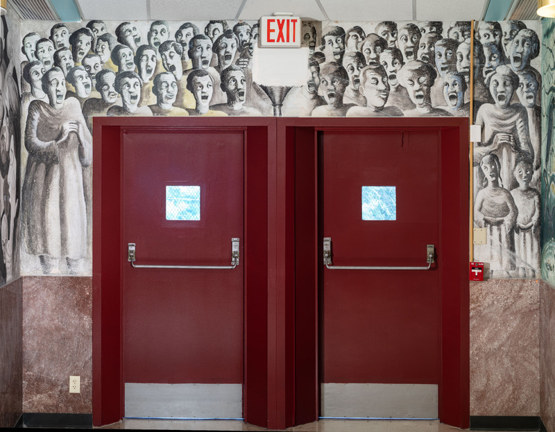 A full church choir sings passionately. Hatter chose this location to make use of the rectangular shape of the doorway, suggesting the arrangement of a choir standing on risers. The exit sign, which was previously embedded on the wall, cast rays of light across the choir members’ faces.