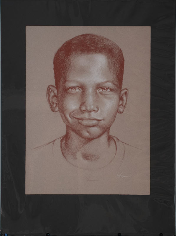 Onyeiwu’s drawing is of a young boy wearing a smirk on his face. Onyeiwu creates incredible, realistic portraits with fine details. Originally from Nigeria, Onyeiwu received his undergraduate arts degree from Texas Southern, and has since returned to teach drawing and painting classes at TSU.
