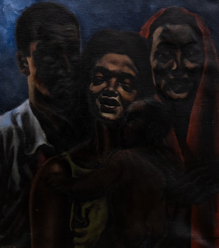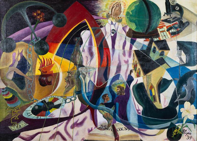 Harper T. Phillips was an artist from Courtland, AL. Discernment is a vivid landscape of surrealism (or a surrealist landscape). The right side has a white background displaying relationships between religion and science. The left black side shows connections between morality and mortality.
