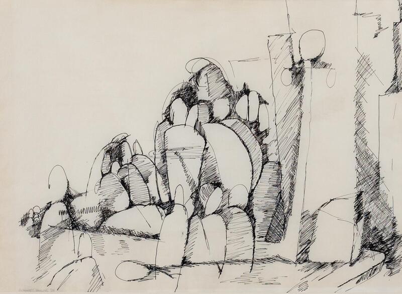 Jewell Woodard Simon was an internationally acclaimed artist, teacher, and poet from Houston, TX. Ensenada Passage illustrates a mountainous path to Ensenada, Mexico. A bridge leading to the city is in the foreground, roads lay in the middle ground, and the mountains build up towards the sky, creating an atmospheric perspective.