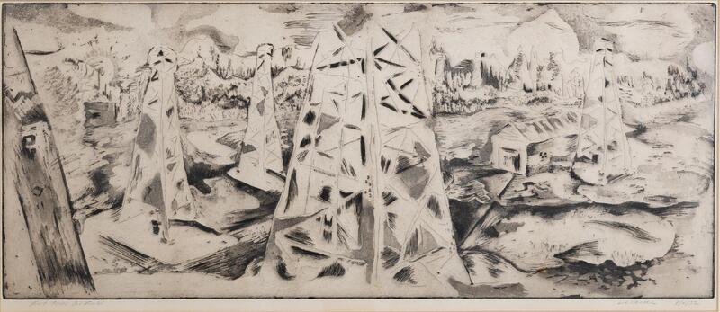Leroy C. Weaver was an artist and art educator from Prarie View, TX. East Texas Oil Field is a print depicting an oil field in East Texas. The print features several oil rigs and workers' living quarters. In the background, a landscape of forest and trees is visible. The drawing shows the oil field from a pilot's perspective.