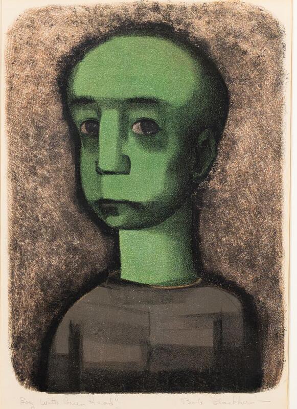 Robert Blackburn was a notable printmaker from Summit, NJ who grew up in Harlem, NY. Boy with Green Head is a print of a green-headed boy wearing a black shirt with a muted background. The boy is looking at the viewer with a pensive expression.