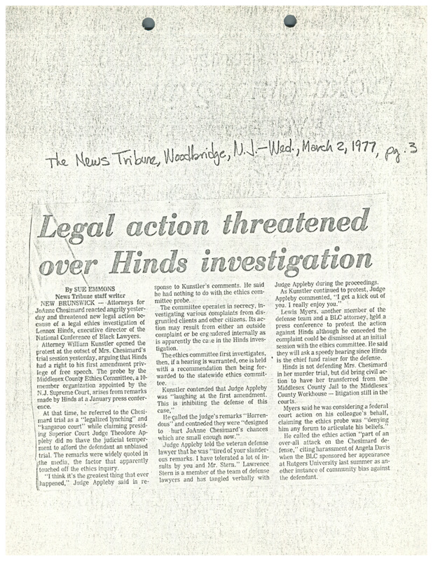 A newspaper article from The News Tribune about Lennox Hinds, president of the National Conference of Black Lawyers, being cited by The Ethics Committee of the Middlesex County Bar Association. Chief defense counsel William Kunstler, representing Assata Shakur (JoAnne Chesimard) in her trial for the 1973 killing of a state trooper, protested it.