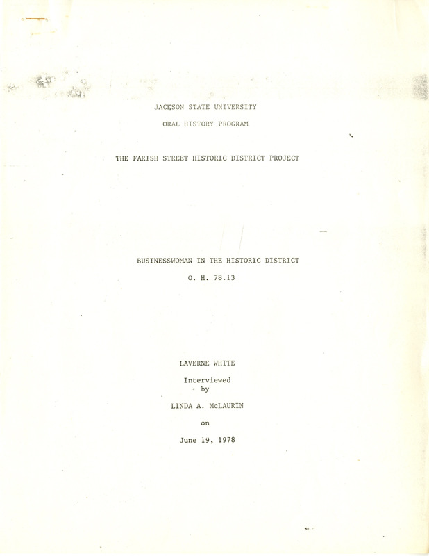 Laverne White moved to Jackson when she was 9 years old and was married to Jackson’s police sergeant for over 40 years. In the interview she talks about her education; her 21-year employment at Boot's Flower Shop in the Farish Street District; her participation in civil rights marches; and the deterioration of the Farish Street District.