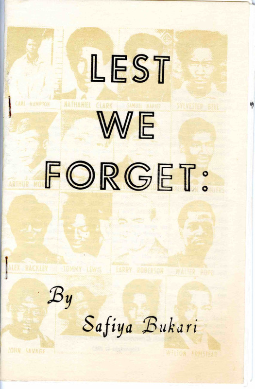 A booklet written by Bernice Jones (aka Safiya Bukhari), who was a Black Panther Party member and vice president of the Republic of New Afrika. The booklet lists members of the Black Panther Party who were killed between 1966 and 1981. There is also a memorial write up and poem in the conclusion.