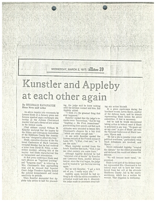 A newspaper article from The Home News about arguing between chief defense counsel William Kunstler and Superior Court Judge Theodore Appleby in the trial of Assata Shakur (JoAnne Chesimard) for the 1973 killing of a state trooper. The argument centered on a citation given to Lennox Hinds, president of the National Conference of Black Lawyers.