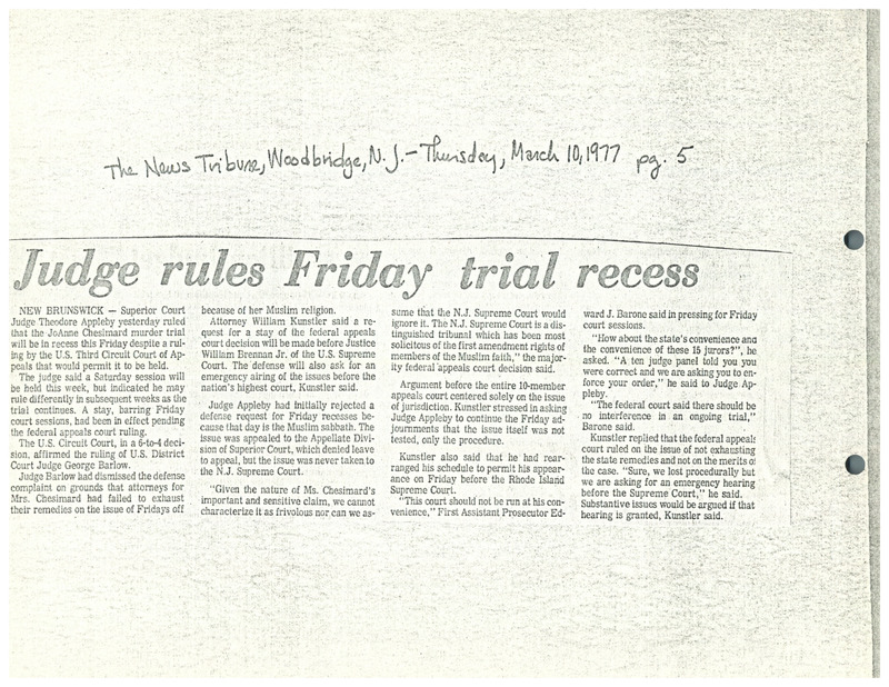 An article from The News Tribune about the question of Friday recesses asked for by the defense because of the Muslim faith of Assata Shakur (JoAnne Chesimard), who was on trial for the 1973 killing of a state trooper. The question has been a feature of the trial and the defense, prosecution, and judge continue to argue over it.