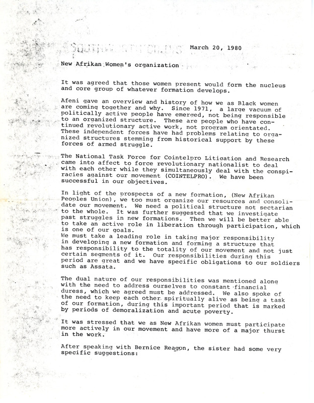 Minutes from a meeting of the New Afrikan Women’s Organization. Organizational plans to move forward with the new organization are discussed, especially in light of the vacuum left since 1971 in radical movements. Finances, future conferences, and methods of operation were also discussed in the meeting.
