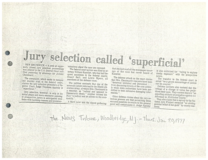 A newspaper article from The News Tribune about defense attorneys for Assata Shakur (JoAnne Chesimard), who was on trial for the 1973 killing of a state trooper, filing a complaint claiming that the jury selection in her murder trial is biased toward the prosecution. Shakur was convicted in 1977 of the killing and escaped prison in 1979.