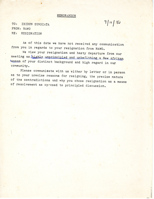 A letter from New Afrikan Women’s Organization (NAWO) leadership to Ibidun Sundiata (aka Dorothy Morrow) inquiring about her sudden resignation from the organization. Ibidun Sundiata was a well-respected and regarded activist and the members of the NAWO want clarification on why she resigned without a conversation with the group.