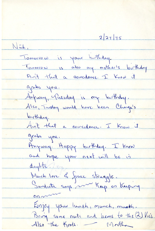 A letter to Nuh Abdul Qaiyum from Martha Pitts wishing him a happy birthday while he is in prison. The letter contains birthday messages from others as well, including Assata Shakur (Joanne Chesimard) and Sundiata Acoli. Both of those birthday wishes were relayed through Martha Pitts, who was a friend and confidant to each of them.