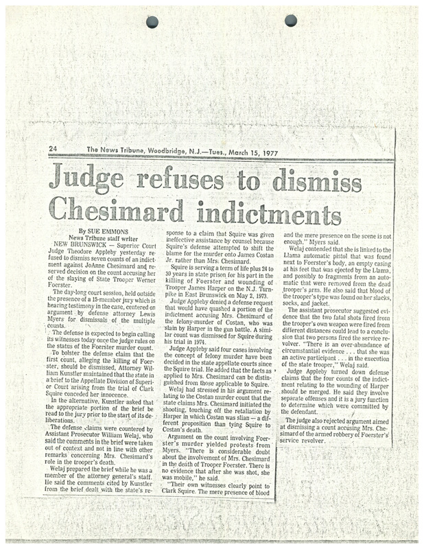 A newspaper article from The News Tribune about a day long juryless court session where defense lawyers made numerous motions to dismiss the indictments against Assata Shakur (JoAnne Chesimard) who was on trial for the 1973 killing of a state trooper. The judge rejected these motions and the attorneys are scheduled to call witnesses that day.