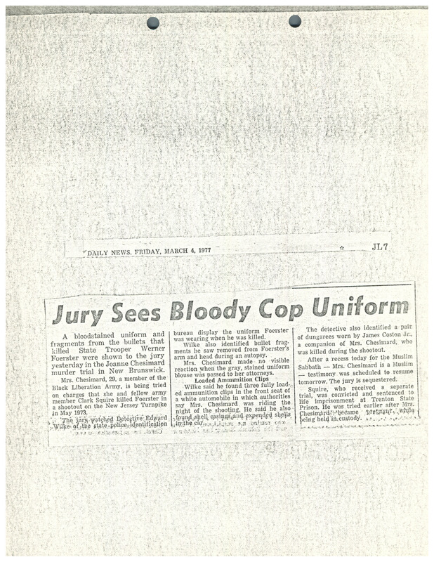 A newspaper article from The Daily News about items entered into evidence by the prosecution in the Assata Shakur (JoAnne Chesimard) trial for the 1973 killing of a state trooper. The slain trooper’s bloodied uniform shirt was submitted into evidence, as well as bullet fragments pulled from the body, and empty shell casings.